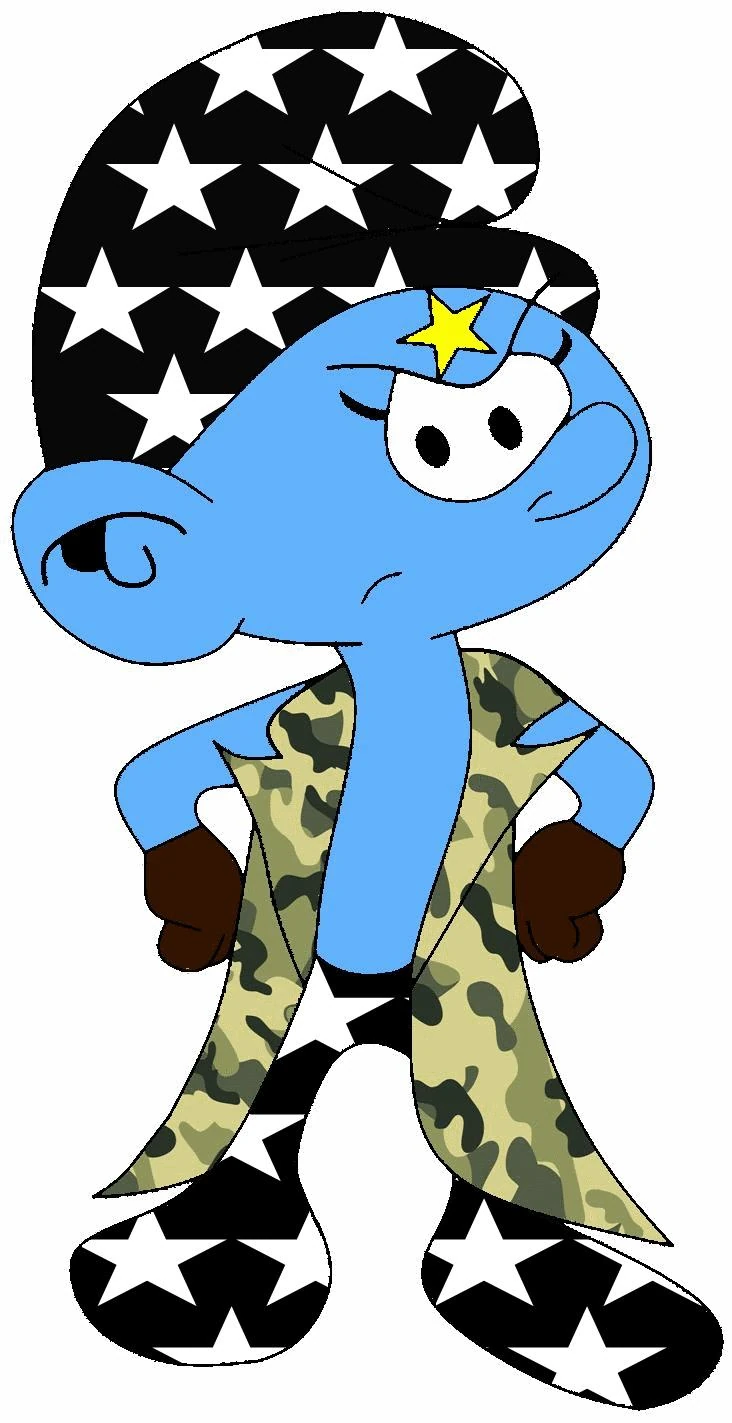 He is a young Smurfling that wears a star patterned Smurf hat and matching pants. He also wears a long camouflage coat with the sleeves pulled up. He wears brown leather gloves. He has a star on his forehead, as the result of blending Poppian DNA with that of a Smurf/Sunwalker hybrid. He appeared to at a point have hair, since his scalp looks shaved.