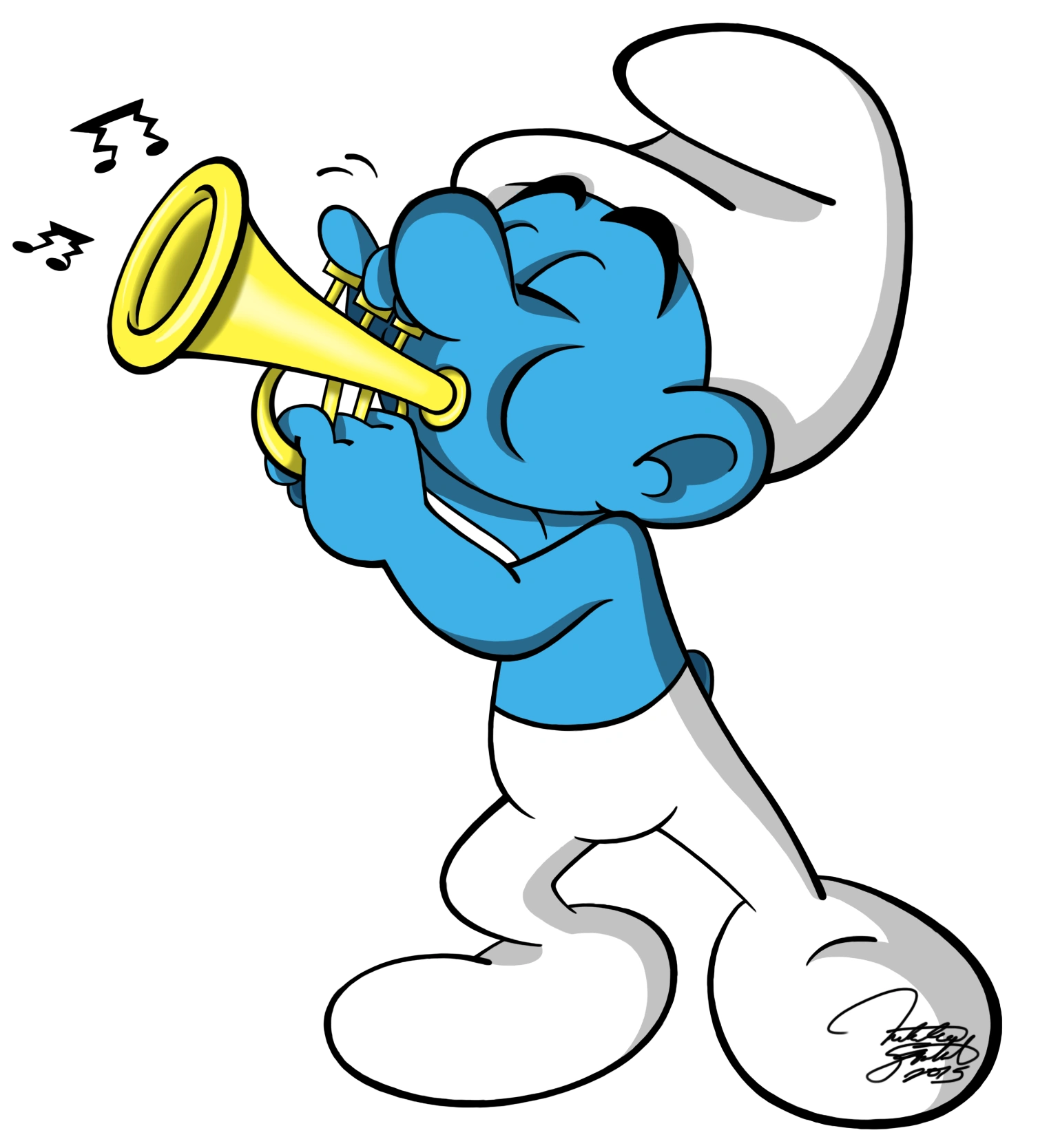 Harmon is like any other Smurf, wearing the generic white Smurf hat and trousers. What sets him apart is his habit of having his trumpet on hand at every given chance.