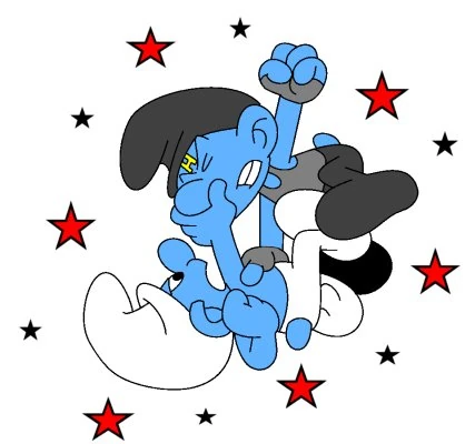 During the fight the quarterstaff's break and the fight turns into an all out brawl between the two, eventually leaving the two of them badly bruised and beaten. They awaken the next morning in the village hospital, with Papa Smurf furious with the two of them.