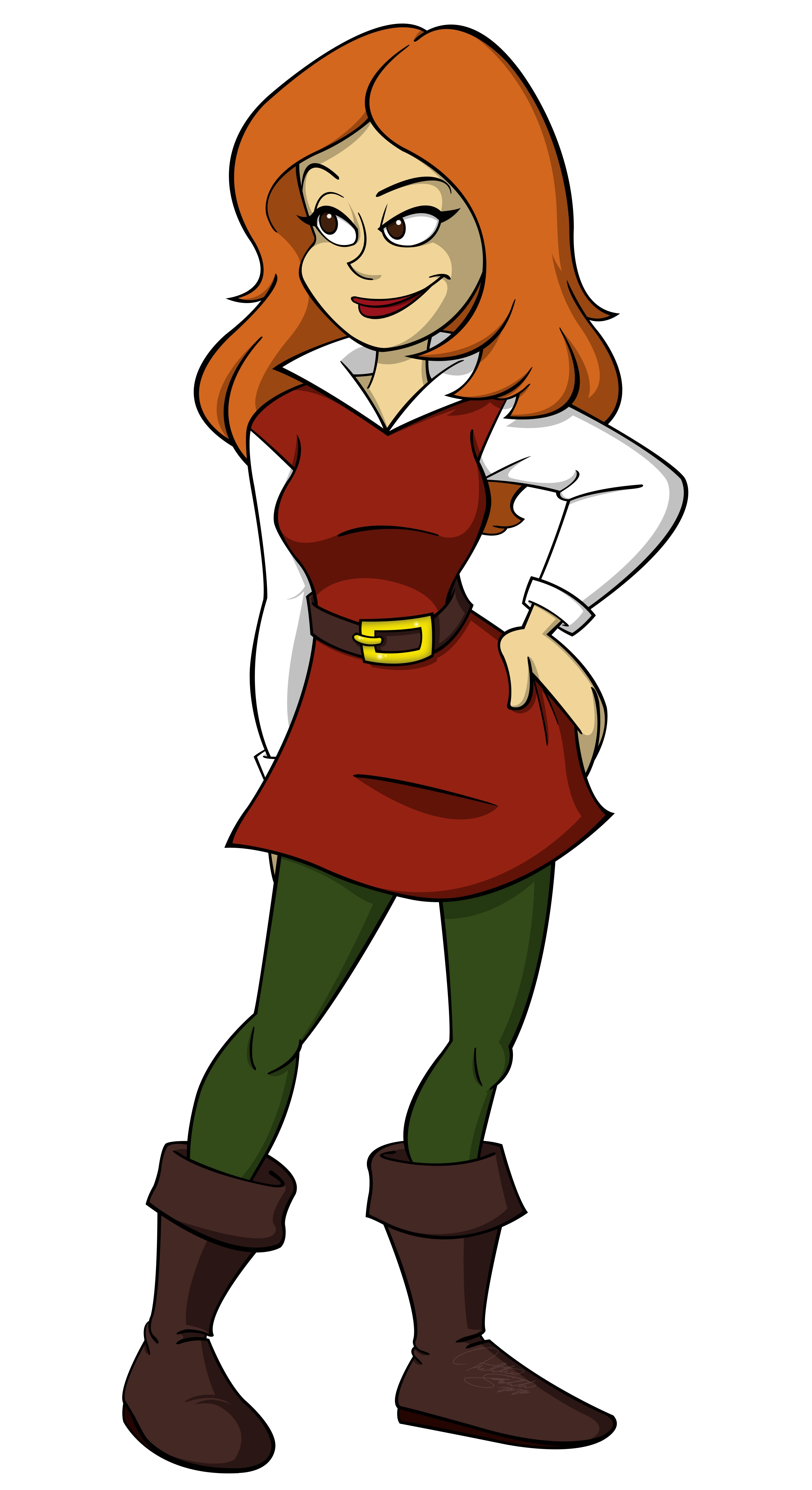 When she's not dressed as royalty, she sports a rustic red tunic over a white long sleeve shirt with a peaked collar, a brown waist belt with a gold buckle, green leggings, and calf-length brown boots. She wears her hair down and sometimes wields her archery case or a sword and sheath. This depends on what she can get away with before Dame Barbara sees her.