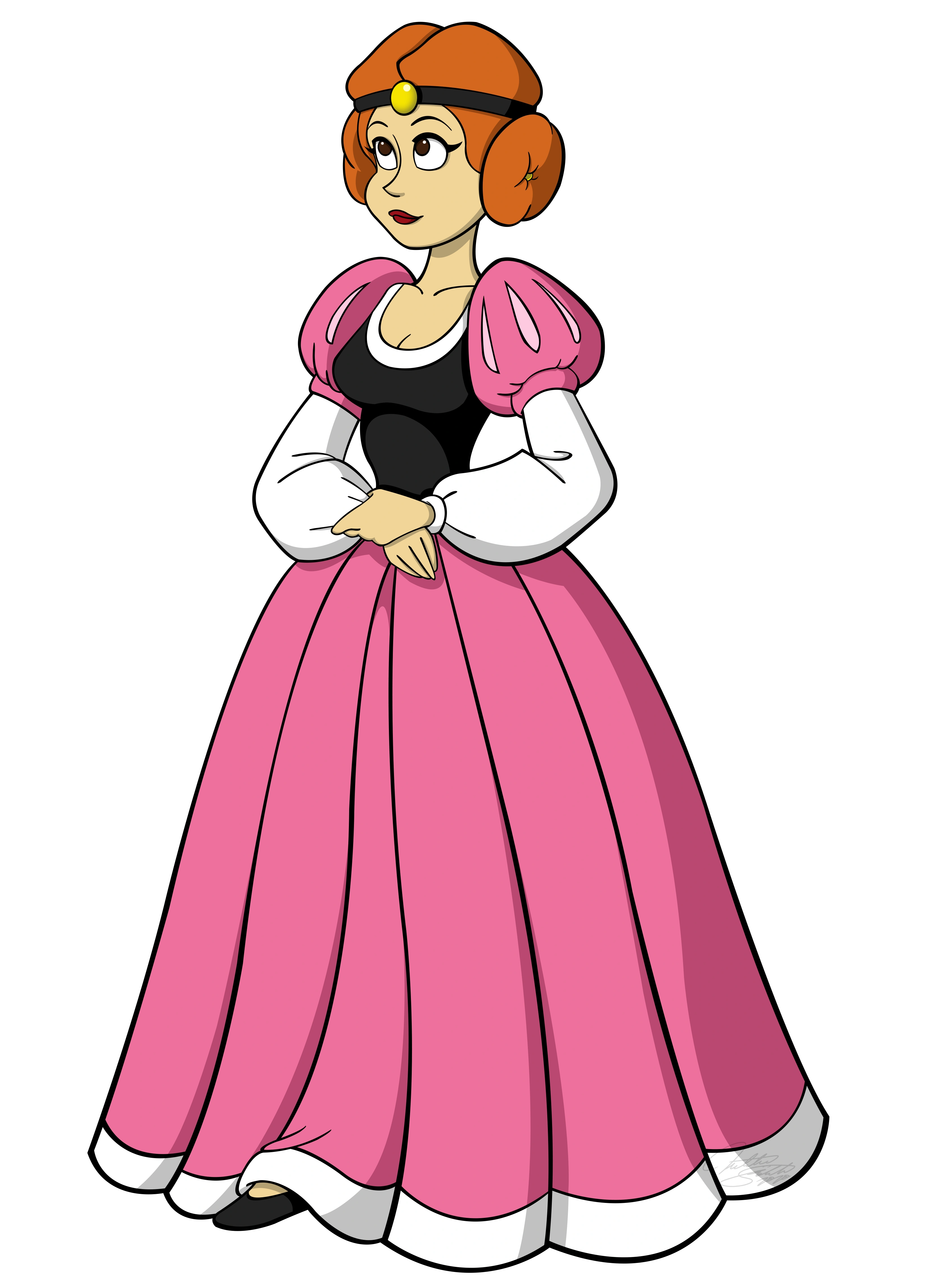 Season 1 -- From mainstream media, she has a gown with puffy pink shoulder pads, white sleeves, a black torso piece with a white scoop neck band, and long pink tresses reaching her ankles. Her little black flats are extenuated by a black and gold bandeau around her forehead. She wears her orange hair parted down the middle and rolled up in tight buns that hide her ears (similar to Princess Leia of the Star Wars franchise).