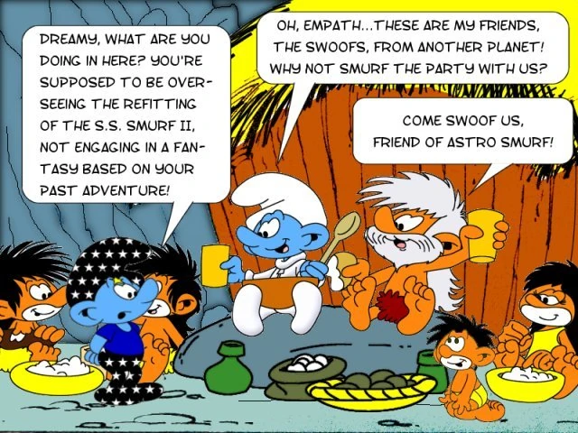 In the fanfiction story, "Where No Smurf Has Gone Before", Empath has found Dreamy inside the Imaginarium reliving the fantasy of being with the Swoofs, despite knowing that they were now just fantasy creations. Their behaviors differ from the original versions in that they are more hospitable and more likely to allow Dreamy to stay with them and do whatever he wants with them for as long as he desires, since they are only fantasy creations and not Smurfs disguised as Swoofs.